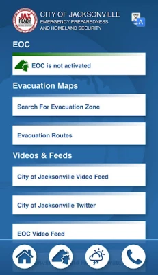 Are you ready? JaxReady— brought to you by the Emergency Preparedness Division and Information Technologies Division of the City of Jacksonville, Florida— will help you monitor weather threats and plan for evacuation in the event of a natural disaster. JaxReady provides access to current threat levels, weather reports, and wildfire updates, as well as up-to-the-minute news feeds for emergency preparedness and evacuation.