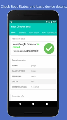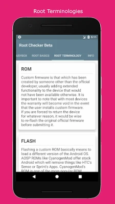 Root Check is a great root checker tool for anyone who is interested in becoming, or is a root Android user. It provides a helpful root terminology and everything you need to get your root journey started. Root Check will not root your device, but it will give you expert knowledge and point you in the right direction.